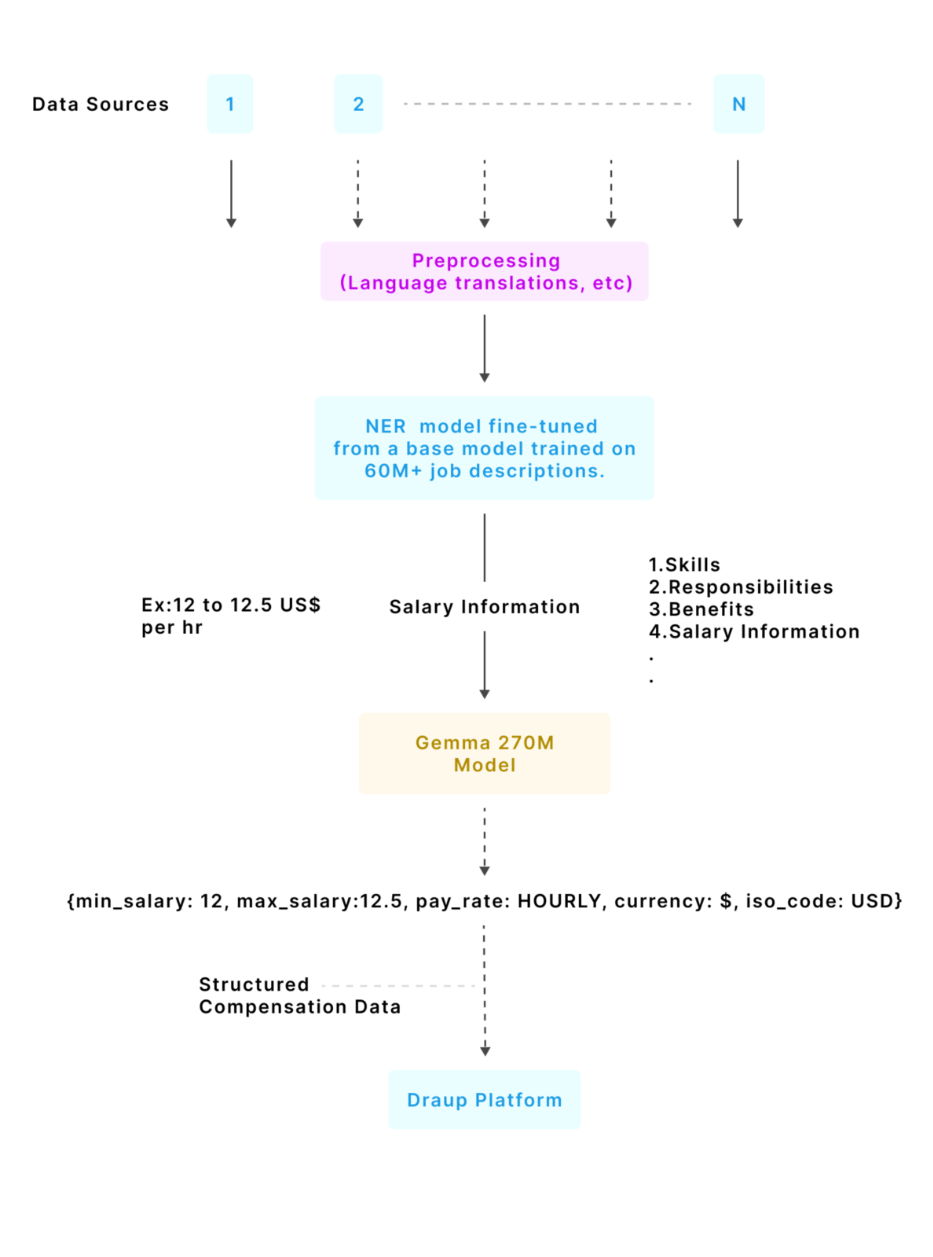Job descriptions first go through preprocessing (including language translations and normalization). Then Draup’s in-house NER system identifies and extracts salary text from job descriptions. This NER model is fine-tuned from a RoBERTa (Robustly Optimized BERT Pretraining Approach) base developed by Meta AI, which was continually pretrained on 60M+ job descriptions to recognize compensation patterns across varied formats and locales. The fine-tuned model builds on this foundation to extract 20+ entity types, including salary-related information.