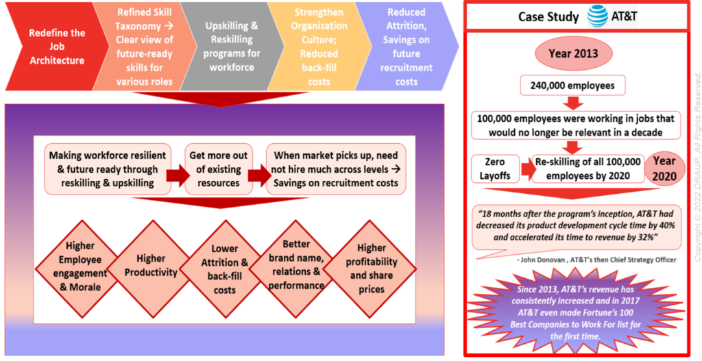 We are very much in a state where reskilling and upskilling should be the focus. Some experts used the term “Perpetual Acceleration” – a state in which we need to be – to drive innovation and win the market. The following slide shows the list of activities that HR leaders should consider undertaking. Recruiters and Workforce Planners can play a significant role in developing Pipeline Talent. Existing internal talent may also play a critical role with the right level of reskilling and upskilling. AT&T did not get enough recognition for the reskilling they focused on when the wireline business became wireless in 2013. AT&T’s strategic office designed a vast-scale reskilling program in 2013 to handle this labor migration from wireline to wireless.
